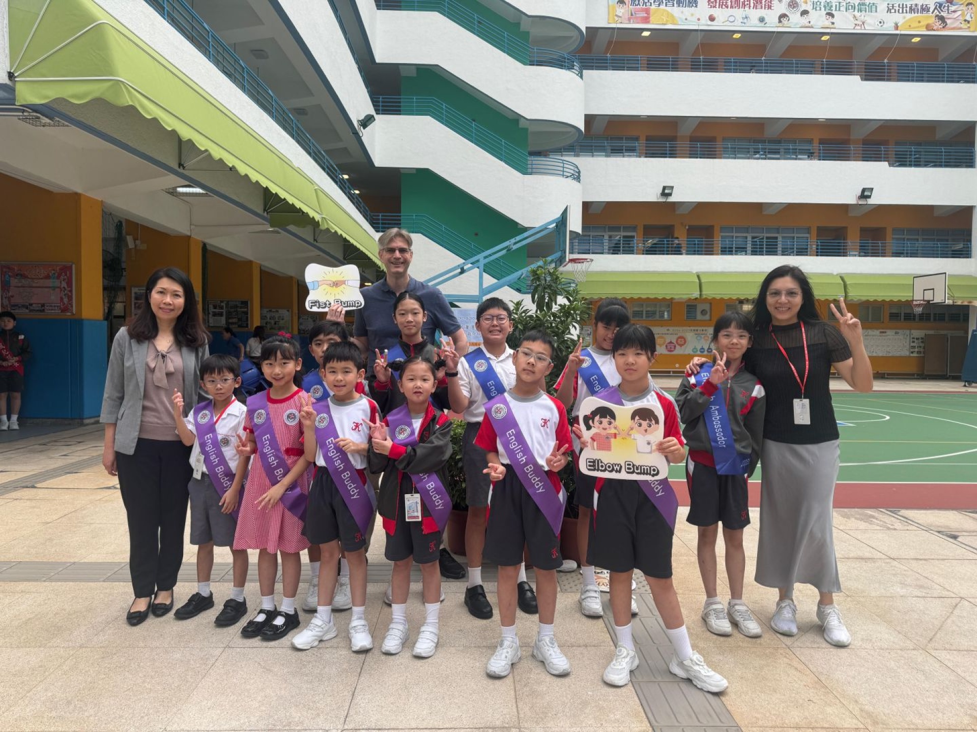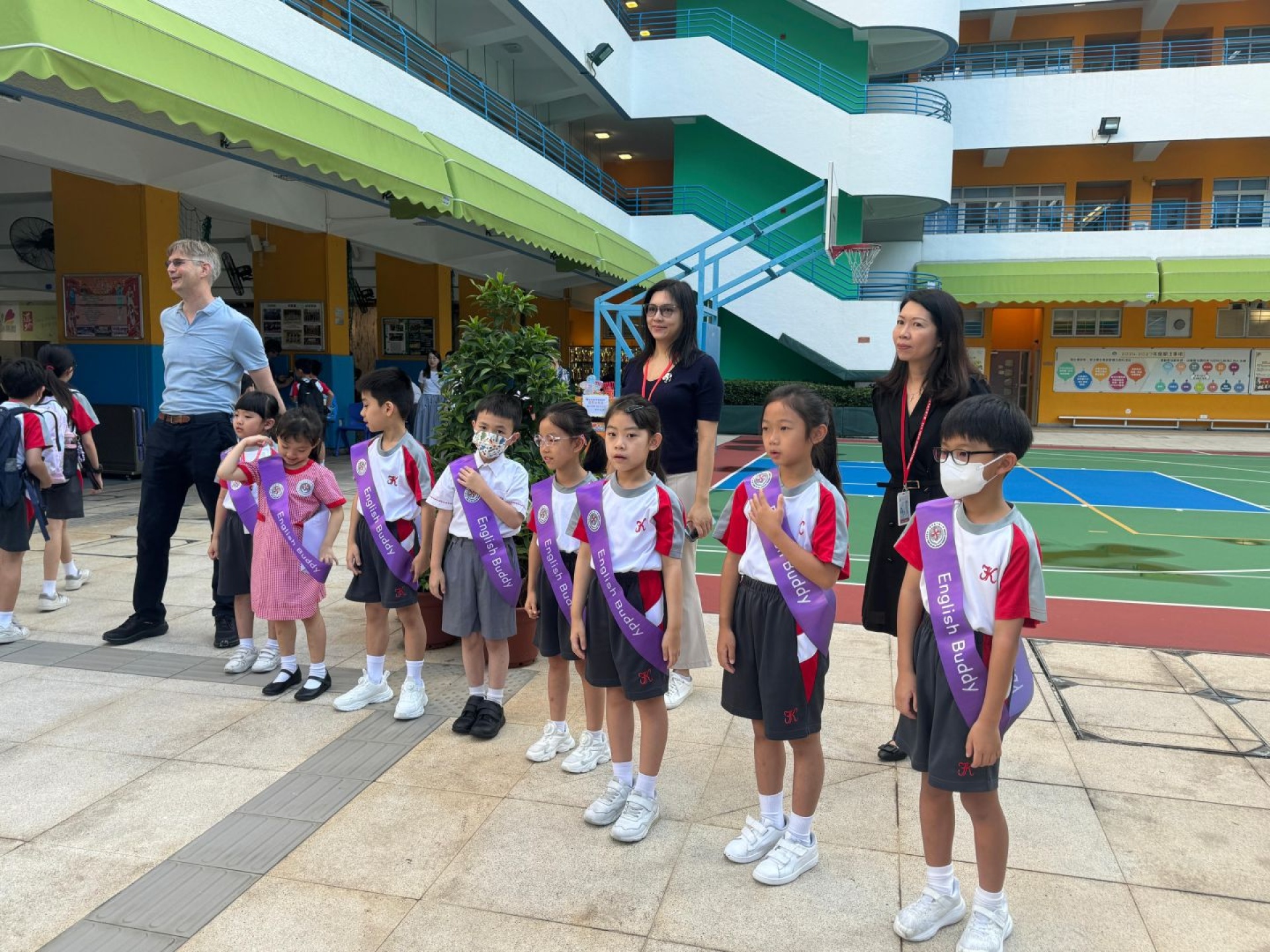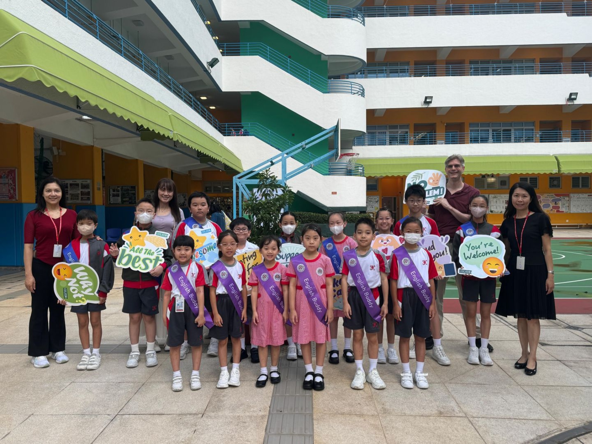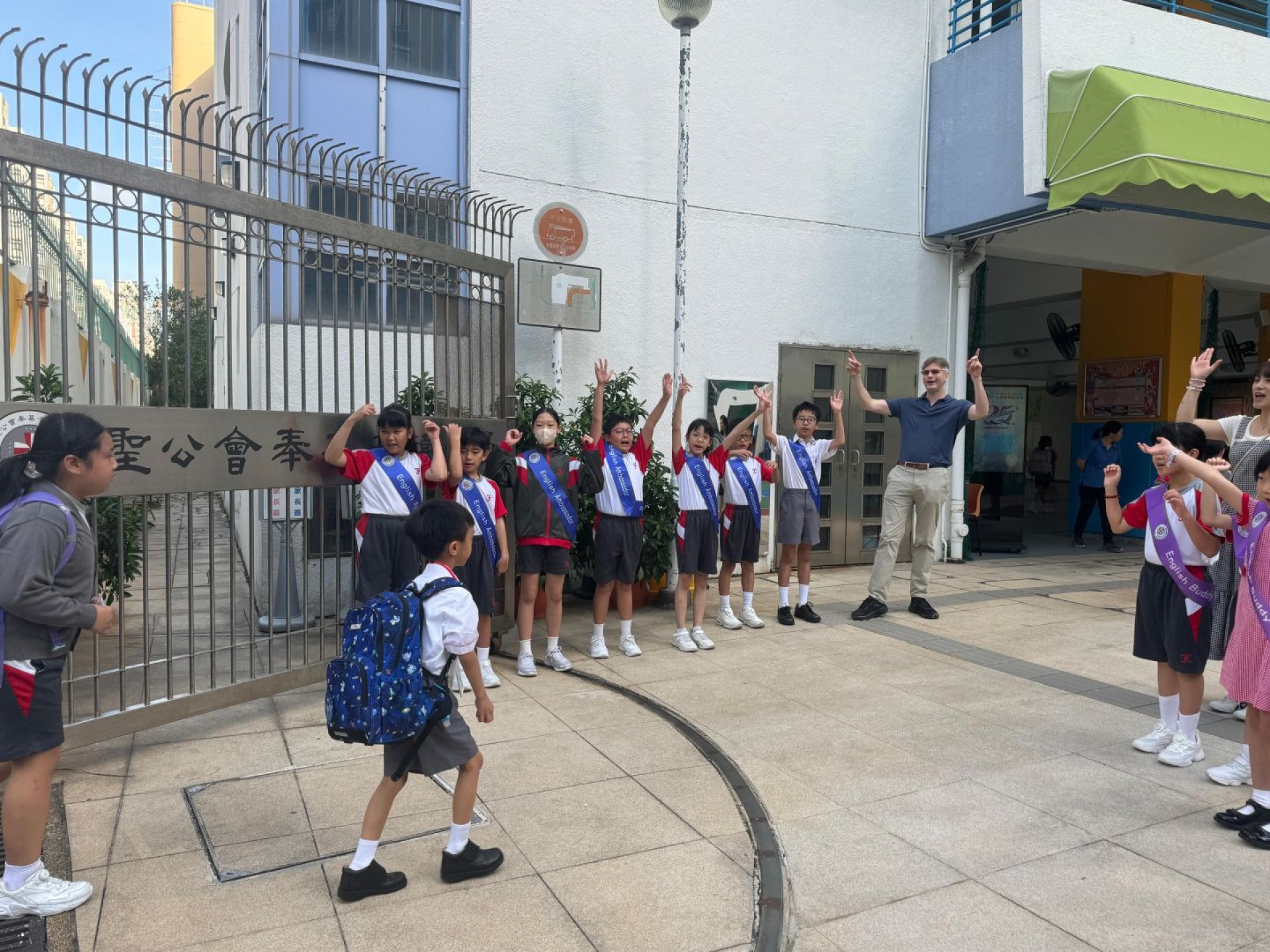 English Buddies and English Ambassadors welcome schoolmates every Monday with English songs and greetings at the school gate. The greetings make every FKMPS kid feel warm and excited. English Buddies and English Ambassadors pick up new English words from the songs. They also learn to use English greetings in daily life.